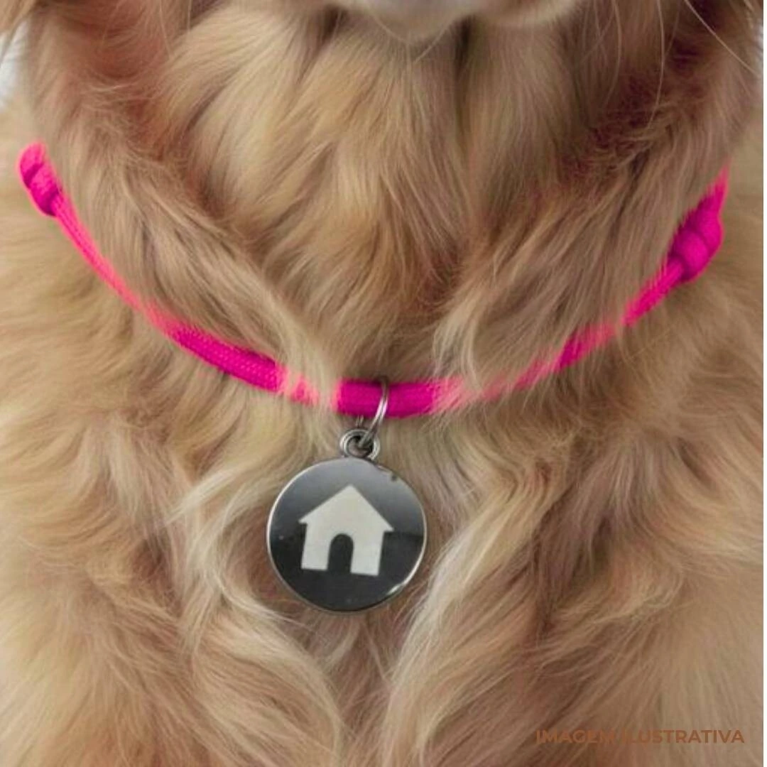 De um lado vem gravado a casinha do nosso logo para preservar o pet durante passeios, fotos, etc.