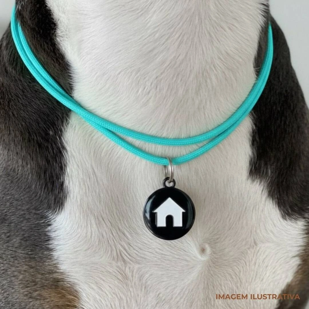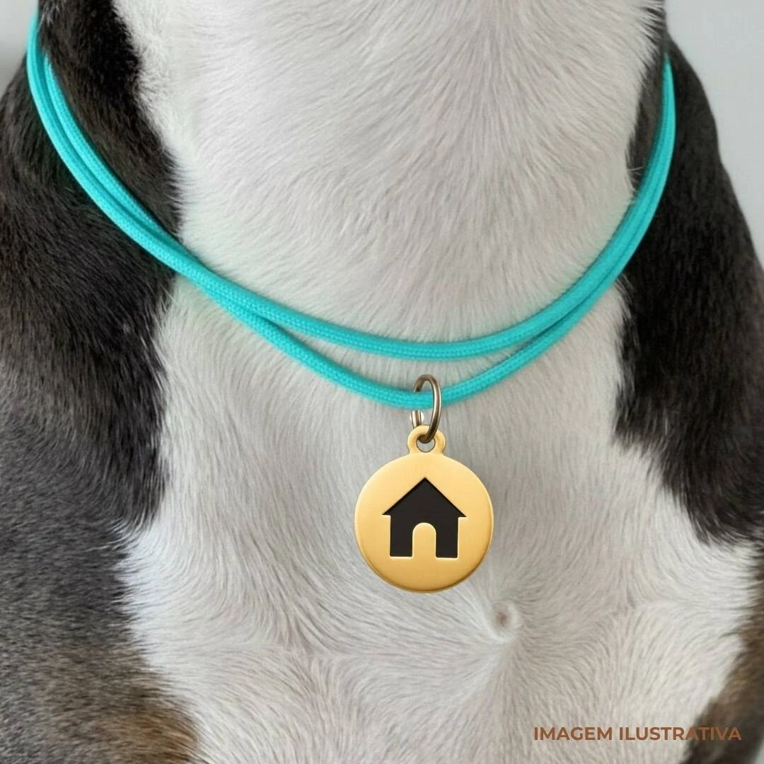 De um lado vem gravado a casinha do nosso logo para preservar o pet durante passeios, fotos, etc.
