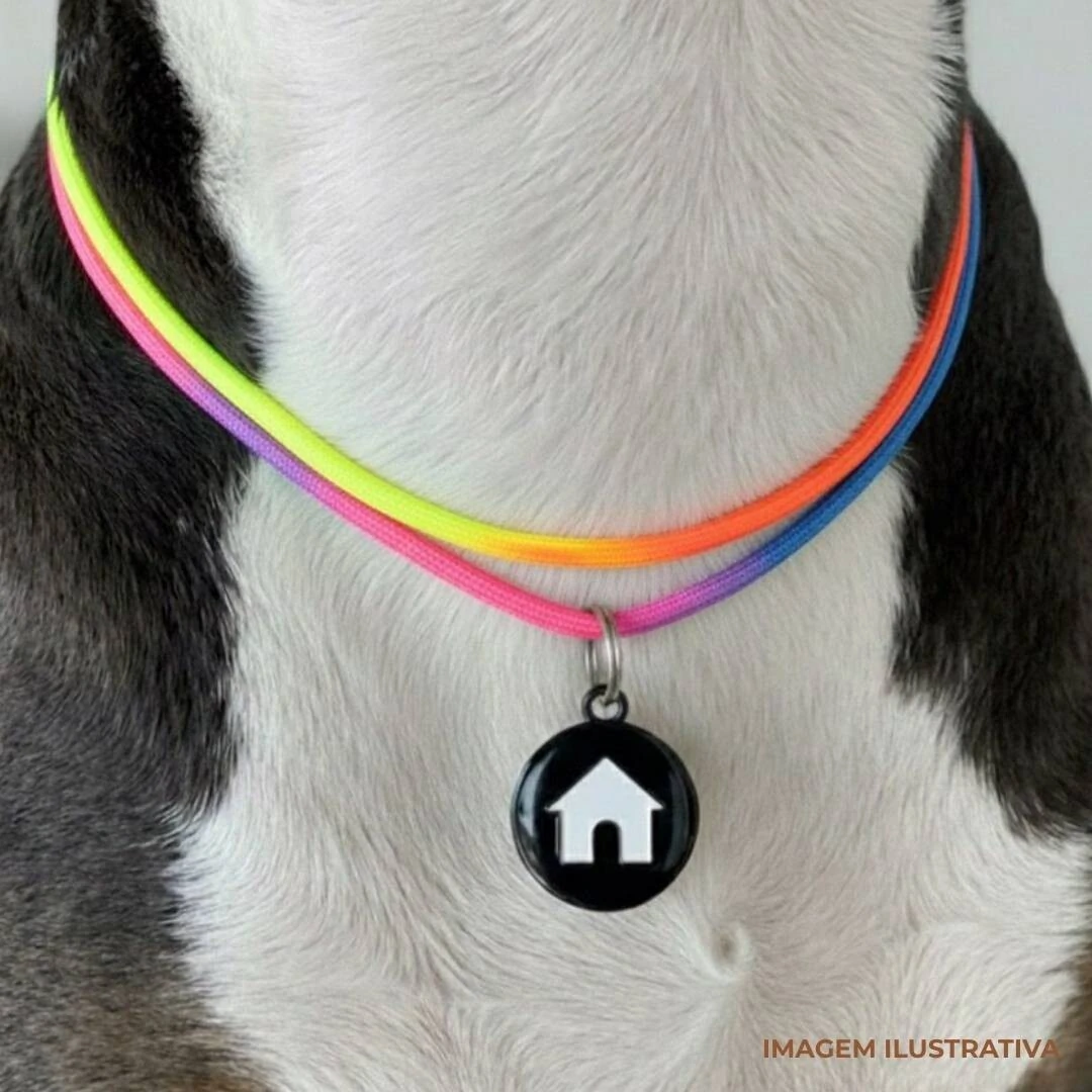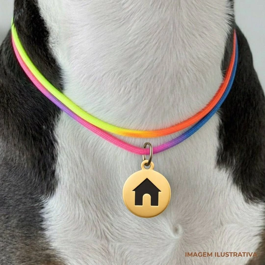 De um lado vem gravado a casinha do nosso logo para preservar o pet durante passeios, fotos, etc.