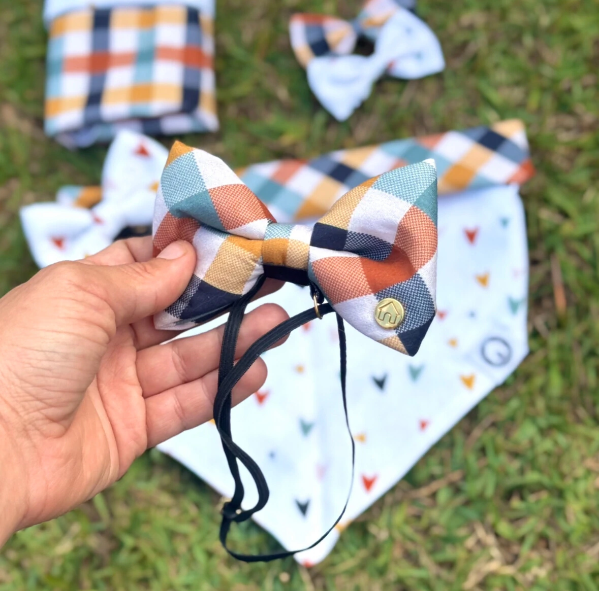 - Estampa frente da bandana - Xadrez em tons de azul e terra