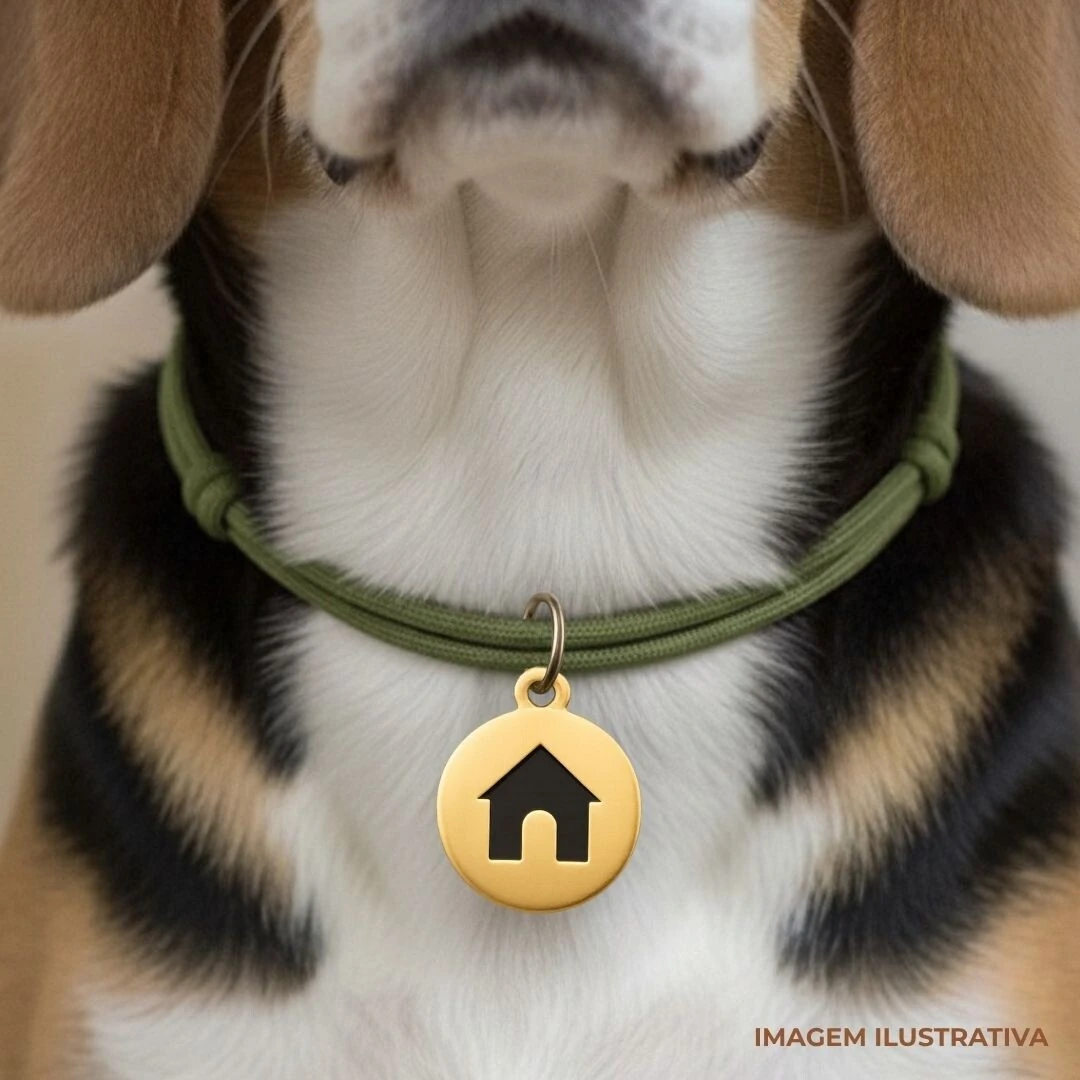 De um lado vem gravado a casinha do nosso logo para preservar o pet durante passeios, fotos, etc.