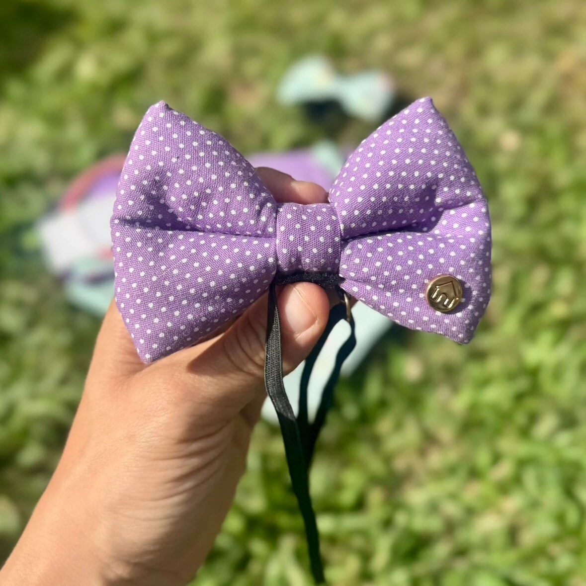 - Estampa verso da bandana - tecido roxinho com bolinhas brancas