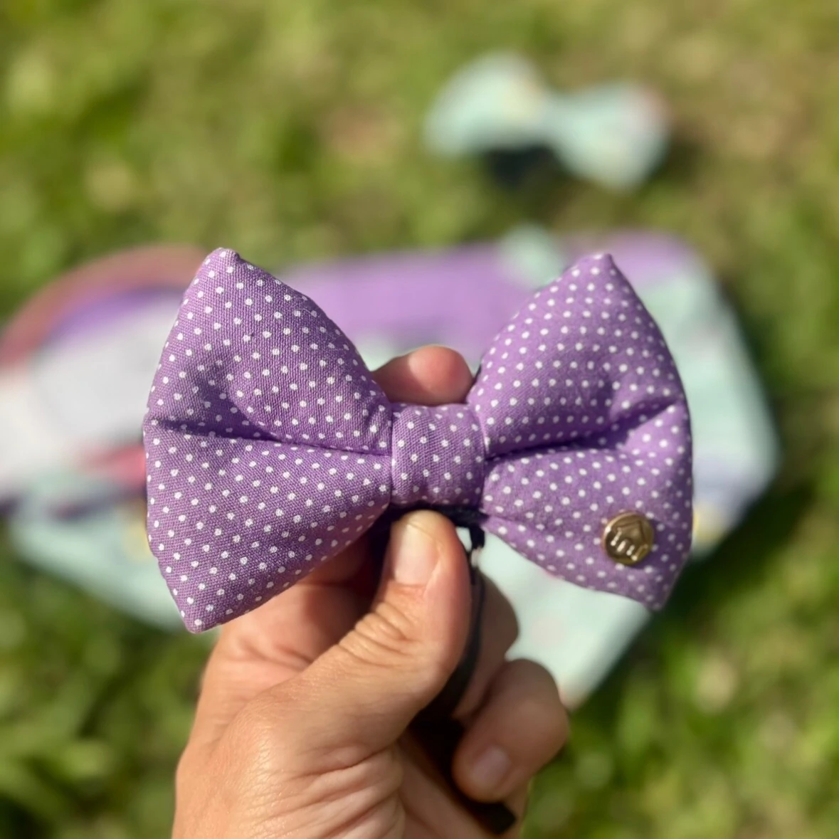 - Estampa verso da bandana - tecido roxinho com bolinhas brancas